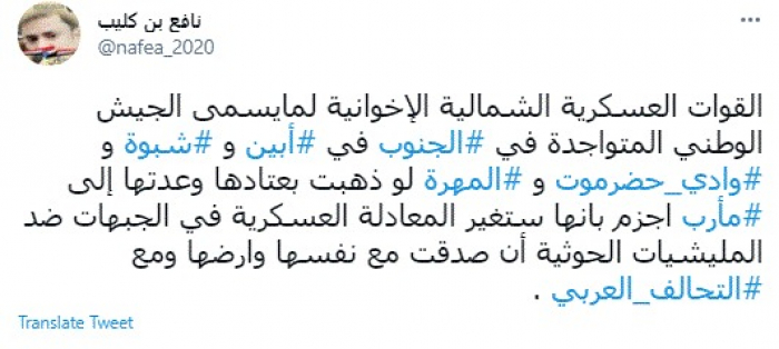 وكتب في تغريدة عبر "تويتر" رصدها "المشهد العربي": "القوات العسكرية الشمالية الإخوانية لما يسمى الجيش الوطني المتواجدة في الجنوب في أبين وشبوة ووادي حضرموت والمهرة لو ذهبت بعتادها وعدتها إلى مأرب اجزم بانها ستغير المعادلة العسكرية في الجبهات ضد المليشيات الحوثية أن صدقت مع نفسها وأرضها ومع التحالف العربي".