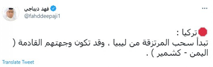 وقال في تغريدة عبر "تويتر" رصدها "المشهد العربي": "تركيا: تبدأ سحب المرتزقة من ليبيا ، وقد تكون وجهتهم القادمة ( اليمن - كشمير )".