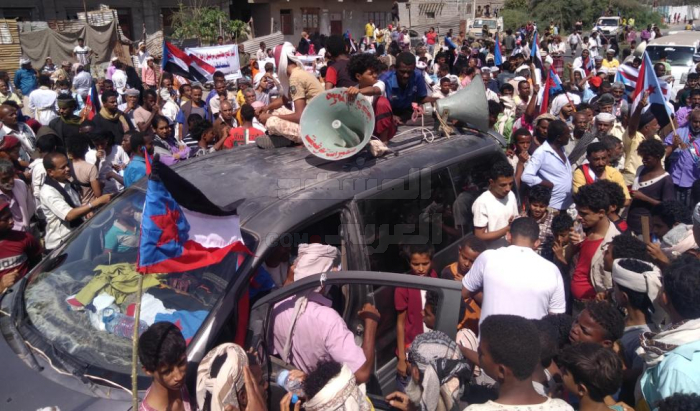 وخرجت جموع غفيرة في مسيرة شعبية حاشدة من ساحة الحرية وسط مدينة الحوطة، إلى مبنى السلطة المحلية في مقرها المؤقت بمكتب الصحة.