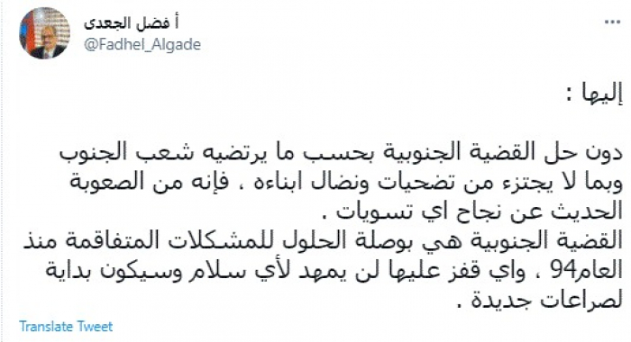 وقال في تغريدة عبر "تويتر" رصدها "المشهد العربي": "دون حل القضية الجنوبية بحسب ما يرتضيه شعب الجنوب وبما لا يجتزء من تضحيات ونضال أبناءه، فإنه من الصعوبة الحديث عن نجاح أي تسويات".