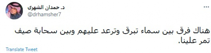 وقال في تغريدة عبر "تويتر" رصدها "المشهد العربي": "هناك فرق بين سماء تبرق وترعد عليهم وبين سحابة صيف تمر علينا".