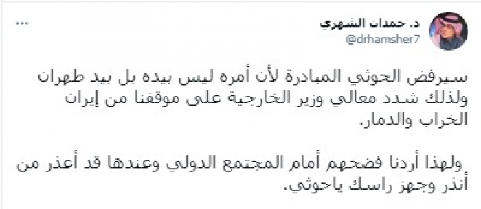 وأكد في تغريدة على حسابه بموقع التدوين المصغر تويتر، اليوم أنه: "سيرفض الحوثي المبادرة لأن أمره ليس بيده بل بيد طهران".