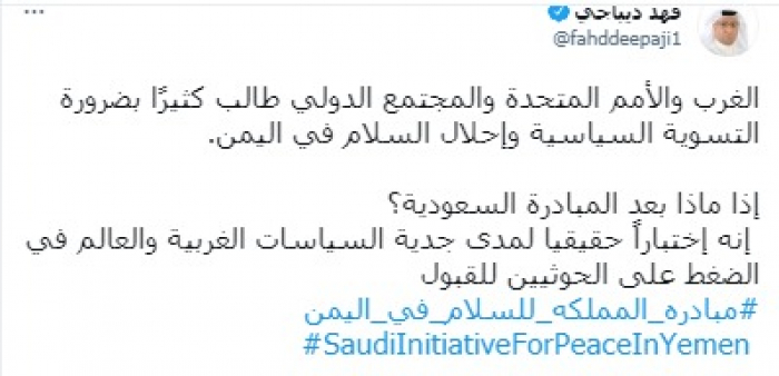 رأى المحلل السياسي السعودي فهد ديباجي أن مبادرة السلام السعودية في اليمن، اختبار لجدية الغرب في الضغط على مليشيا الحوثي الإرهابية للقبول.