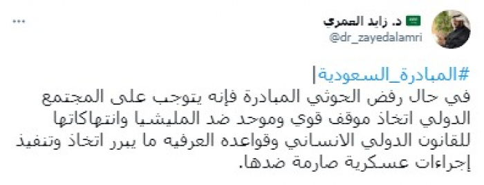 وشدد في تغريدة على حسابه بموقع التدوين المصغر تويتر، اليوم على أنه: "في حال رفض الحوثي المبادرة فإنه يتوجب على المجتمع الدولي اتخاذ موقف قوي وموحد ضد المليشيا وانتهاكاتها للقانون الدولي الإنساني وقواعده العرفية".