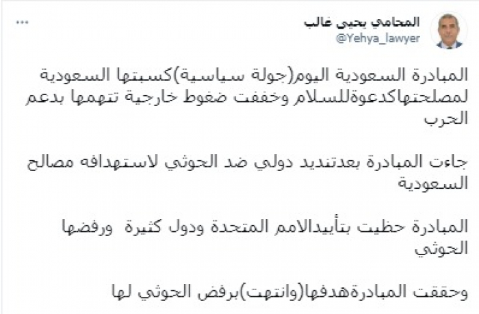 وقال في تغريدة على حسابه بموقع التدوين المصغر تويتر، اليوم إن: "المبادرة السعودية اليوم (جولة سياسية) كسبتها السعودية لمصلحتها كدعوة للسلام، وخففت ضغوطا خارجية تتهمها بدعم الحرب".