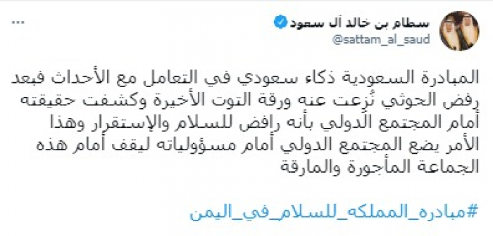 اعتبر الأمير السعودي سطام بن خالد آل سعود أن مبادرة المملكة لإحلال السلام في اليمن، نزعت ورقة التوت عن مليشيا الحوثي الإرهابية.