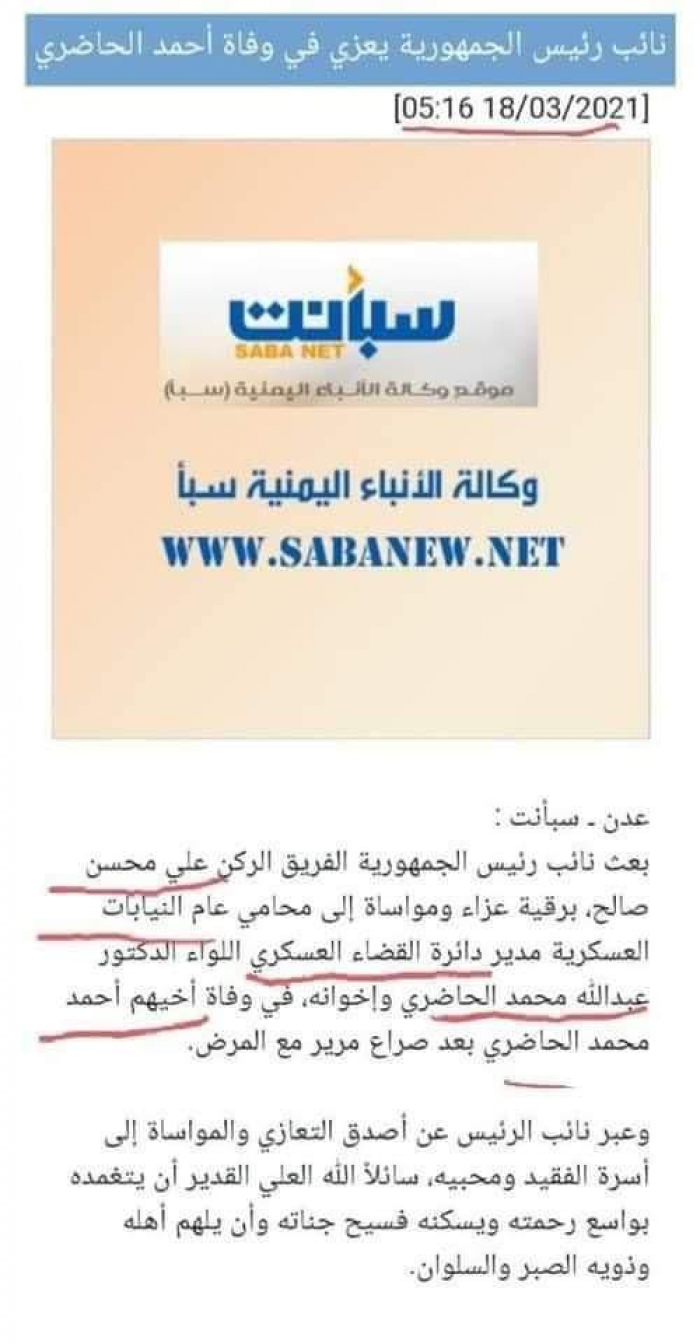 بعث الجنرال الإرهابي المدعو علي محسن الأحمر، برقية عزاء ومواساة إلى ذراعه الأيمن المحامي العام للنيابات العسكرية ومدير دائرة القضاء العسكري لمليشيات الشرعية الإخوانية المدعو عبدالله محمد الحاضري، بمقتل شقيقه القيادي بالمليشيات الحوثية الإرهابية المدعو أحمد محمد الحاضري.