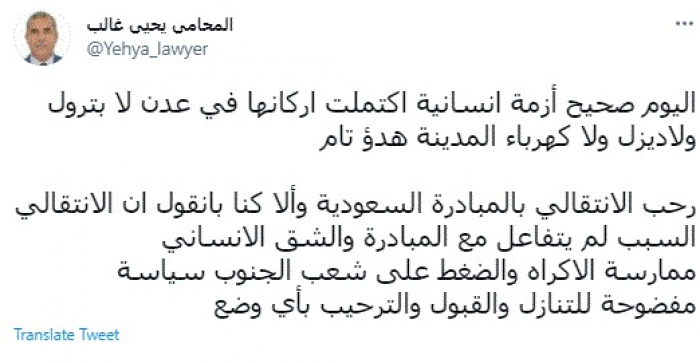 وقال في تغريدة عبر "تويتر" رصدها "المشهد العربي": "اليوم صحيح أزمة إنسانية اكتملت أركانها في عدن لا بترول ولا ديزل ولا كهرباء المدينة هدوء تام".