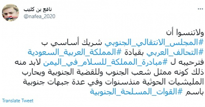 كشف الناشط السياسي نافع بن كليب، اليوم، أهمية ترحيب المجلس الانتقالي الجنوبي بالمبادرة السعودية لحل الأزمة باليمن.