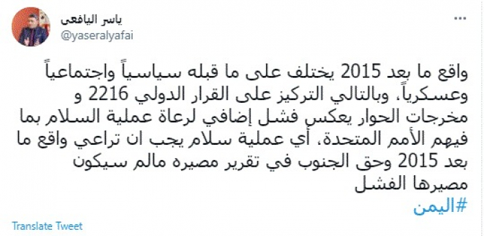 وقال في تغريدة عبر "تويتر" رصدها "المشهد العربي": "واقع ما بعد 2015 يختلف على ما قبله سياسيًا واجتماعيًا وعسكريًا، وبالتالي التركيز على القرار الدولي 2216 و مخرجات الحوار يعكس فشل إضافي لرعاة عملية السلام بما فيهم الأمم المتحدة، أي عملية سلام يجب أن تراعي واقع ما بعد 2015 وحق الجنوب في تقرير مصيره مالم سيكون مصيرها الفشل".