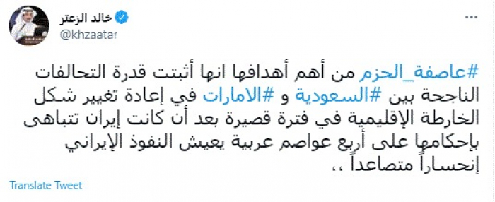 وقال في تغريدة عبر "تويتر" رصدها "المشهد العربي": "عاصفة الحزم من أهم أهدافها أنها أثبتت قدرة التحالفات الناجحة بين السعودية والإمارات في إعادة تغيير شكل الخارطة الإقليمية في فترة قصيرة بعد أن كانت إيران تتباهى بإحكامها على أربع عواصم عربية يعيش النفوذ الإيراني انحسارًا متصاعدًا".