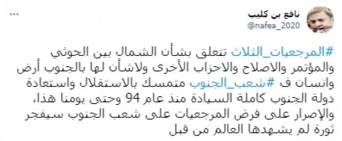 أكد الناشط السياسي نافع بن كليب أن قضية المرجعيات الثلاث ترتبط بالشمال ومكوناته الحزبية والاجتماعية، لا تتعلق بالجنوب، محذرا من محاولة فرضها على الجنوب.