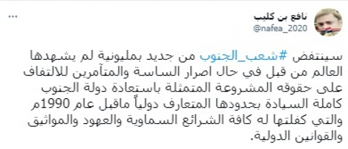 وقال في تغريدة على حسابه بموقع التدوين المصغر تويتر، اليوم: "سينتفض شعب الجنوب من جديد بمليونية لم يشهدها العالم من قبل في حال إصرار الساسة والمتآمرين للالتفاف على حقوقه المشروعة المتمثلة باستعادة دولة الجنوب كاملة السيادة بحدودها المتعارف عليها دوليا ما قبل عام 1990م".