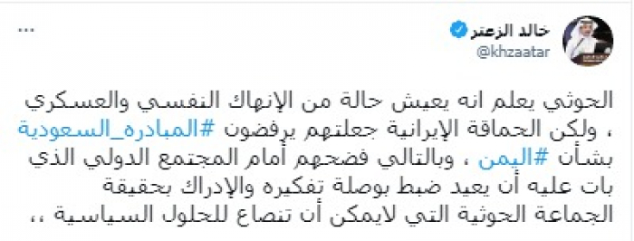 رأى المحلل السياسي السعودي خالد الزعتر، أن مليشيا الحوثي الإرهابية تعاني الإنهاك، موضحا أن رفضها للمبادرة السعودية حماقة إيرانية.