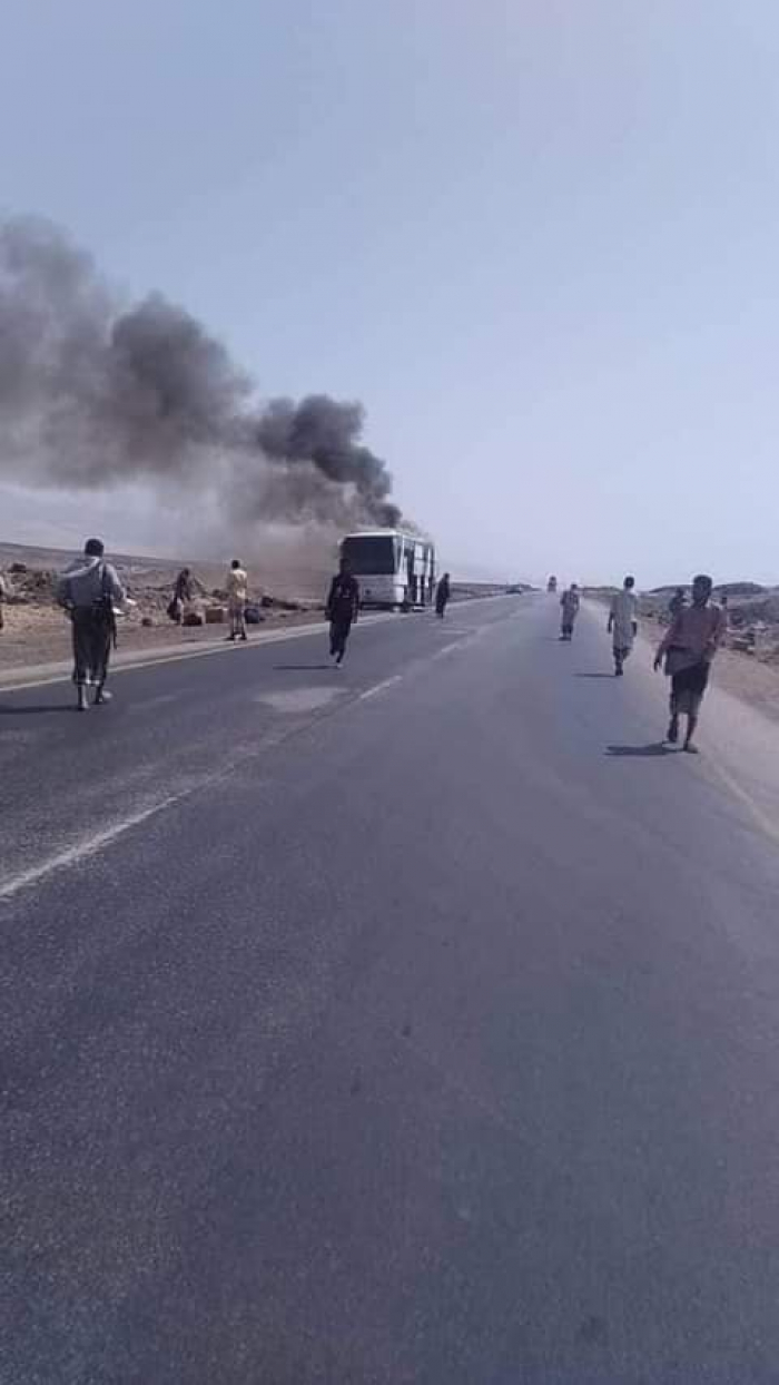اندلع حريق هائل اليوم الأربعاء، في حافلة نقل جماعي بالخط الرابط بين محافظتي حضرموت وشبوة.