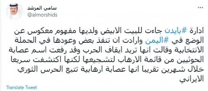 وكتب في تغريدة عبر "تويتر" رصدها "المشهد العربي": "إدارة بايدن جاءت للبيت الابيض ولديها مفهوم معكوس عن الوضع في اليمن وأرادت ان تنفذ بعض وعودها في الحملة الانتخابية وقالت أنها تريد إيقاف الحرب وقد رفعت اسم عصابة الحوثيين من قائمة الإرهاب لتشجيعها لكنها اكتشفت سريعًا خلال شهرين تقريبًا أنها عصابة إرهابية تتبع الحرس الثوري الإيراني".