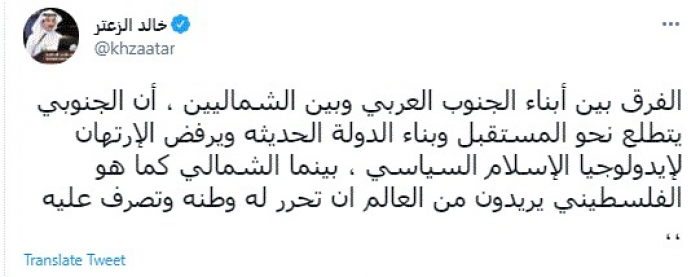 وقال في تغريدة عبر "تويتر" رصدها "المشهد العربي": "الفرق بين أبناء الجنوب العربي وبين الشماليين، أن الجنوبي يتطلع نحو المستقبل وبناء الدولة الحديثة ويرفض الارتهان لأيدولوجيا الإسلام السياسي، بينما الشمالي كما هو الفلسطيني يريدون من العالم أن تحرر له وطنه وتصرف عليه".