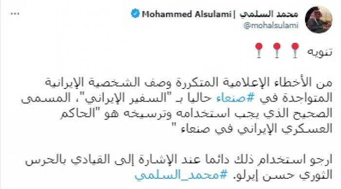 ولفت في تغريدة على حسابه بموقع التدوين المصغر تويتر، اليوم إلى أنه: "تنبيه: من الأخطاء الإعلامية المتكررة وصف الشخصية الإيرانية المتواجدة في صنعاء حاليا بـ "السفير الإيراني".