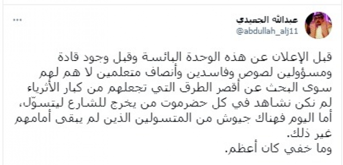 وقال في تغريدة على حسابه بموقع التدوين المصغر تويتر، اليوم إنه: "قبل الإعلان عن هذه الوحدة البائسة وقبل وجود قادة ومسؤولين لصوص وفاسدين وأنصاف متعلمين لا هم لهم سوى البحث عن أقصر الطرق التي تجعلهم من كبار الأثرياء لم نكن نشاهد في كل حضرموت من يخرج للشارع ليتسوّل".