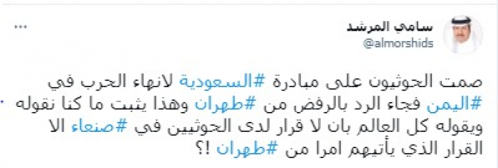 ورأى في تغريدة على حسابه بموقع التدوين المصغر تويتر، اليوم أنه: "صَمَتَ الحوثيون على مبادرة المملكة لإنهاء الحرب في اليمن، فجاء الرد بالرفض من طهران.