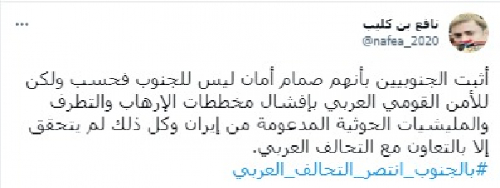 وأوضح في تغريدة على حسابه بموقع التدوين المصغر تويتر، اليوم أنه: "أثبت الجنوبيون أنهم صمام أمان ليس للجنوب فحسب ولكن للأمن القومي العربي بإفشال مخططات الإرهاب والتطرف والمليشيات الحوثية المدعومة من إيران".