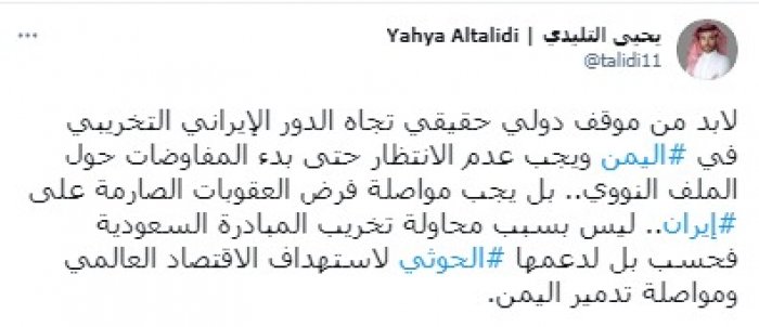 وقال في تغريدة على حسابه بموقع التدوين المصغر تويتر، اليوم إنه: "لا بد من موقف دولي حقيقي تجاه الدور الإيراني التخريبي في اليمن".