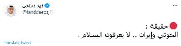 وقال في تغريدة عبر "تويتر" رصدها "المشهد العربي": "حقيقة: الحوثي وإيران .. لا يعرفان السلام".