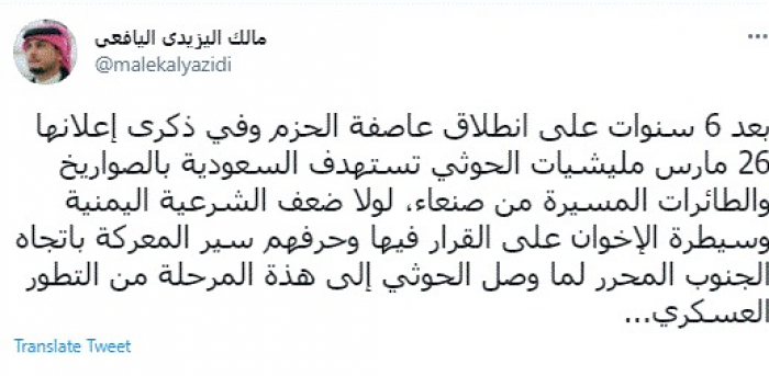 وكتب في تغريدة عبر "تويتر" رصدها "المشهد العربي": "بعد 6 سنوات على انطلاق عاصفة الحزم وفي ذكرى إعلانها 26 مارس مليشيات الحوثي تستهدف السعودية بالصواريخ والطائرات المُسيرة من صنعاء، لولا ضعف الشرعية اليمنية وسيطرة الإخوان على القرار فيها وحرفهم سير المعركة باتجاه الجنوب المحرر لما وصل الحوثي إلى هذة المرحلة من التطور العسكري".