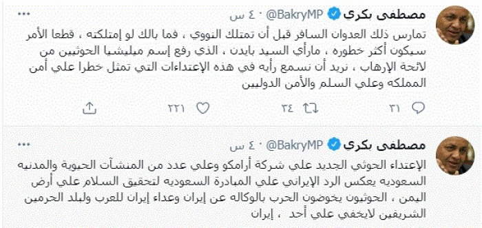 وتابع: "ما رأي السيد بايدن، الذي رفع اسم مليشيا الحوثيين من لائحة الإرهاب، نريد أن نسمع رأيه في هذه الاعتداءات التي تمثل خطرًا على أمن المملكة وعلى السلم والأمن الدوليين".