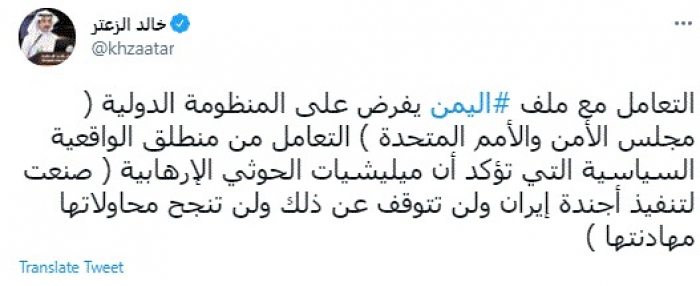دعا المحلل السياسي السعودي خالد الزعتر، اليوم، المنظومة الدولية للتعامل مع الملف اليمني بمنطلق الواقعية السياسية.