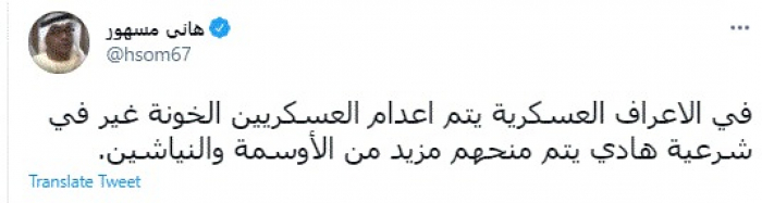 وقال في تغريدة عبر "تويتر" رصدها "المشهد العربي": "في الأعراف العسكرية يتم إعدام العسكريين الخونة غير في شرعية هادي يتم منحهم مزيد من الأوسمة والنياشين".