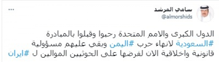 وأشار في تغريدة على حسابه بموقع التدوين المصغر تويتر، اليوم إلى أن: "الدول الكبرى والأمم المتحدة رحبوا وقبلوا بالمبادرة السعودية لإنهاء حرب اليمن".