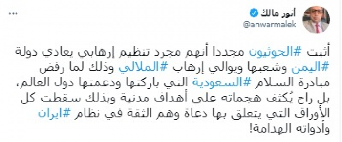 شدد الباحث في الشؤون الدولية أنور مالك على أن مليشيا الحوثي برهنت على أنها تنظيم إرهابي معاد لليمن وشعبه برفض مبادرة السعودية لوقف النار.