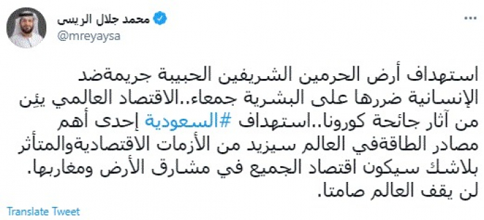 وقال في تغريدة عبر "تويتر" رصدها "المشهد العربي": "استهداف أرض الحرمين الشريفين الحبيبة جريمة ضد الإنسانية ضررها على البشرية جمعاء.. الاقتصاد العالمي يئِن من آثار جائحة كورونا".