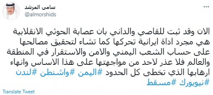 وقال في تغريدة عبر "تويتر" رصدها "المشهد العربي": "الآن وقد ثبت للقاصي والداني بأن عصابة الحوثي الانقلابية هي مجرد أداة إيرانية تحركها كما تشاء لتحقيق مصالحها على حساب الشعب اليمني والأمن والاستقرار في المنطقة والعالم فلا عذر لأحد من مواجهتها على هذا الأساس وإنهاء إرهابها الذي تخطى كل الحدود".