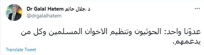 وكتب في تغريدة عبر "تويتر" رصدها "المشهد العربي": "عدوّنا واحد: الحوثيون وتنظيم الإخوان المسلمين وكل من يدعمهم".