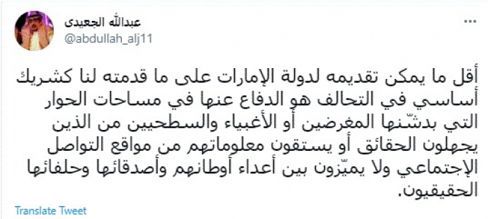 وقال في تغريدة عبر "تويتر" رصدها "المشهد العربي": "أقل ما يمكن تقديمه لدولة الإمارات على ما قدمته لنا كشريك أساسي في التحالف هو الدفاع عنها في مساحات الحوار التي يدشّنها المغرضين أو الأغبياء والسطحيين من الذين يجهلون الحقائق أو يستقون معلوماتهم من مواقع التواصل الإجتماعي ولا يميّزون بين أعداء أوطانهم وأصدقائها وحلفائها الحقيقيون".