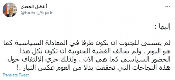 وقال في تغريدة عبر "تويتر" رصدها "المشهد العربي": "لم يتسنَّ للجنوب أن يكون طرفًا في المعادلة السياسية كما هو اليوم، ولم يحالف القضية الجنوبية أن تكون بكل هذا الحضور السياسي كما هي الآن، ولذلك حري الالتفاف حول هذه النجاحات التي تحققت بدلًا من العوم عكس التيار".