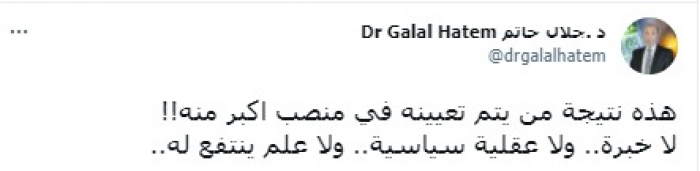وأوضح في تغريدة على حسابه بموقع التدوين المصغر تويتر، اليوم أن: "هذه نتيجة من يتم تعيينه في منصب أكبر منه!! لا خبرة.. ولا عقلية سياسية.. ولا علم ينتفع له".