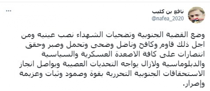 وشدد في تغريدة على حسابه بموقع التدوين المصغر تويتر، اليوم على أنه: "وضع القضية الجنوبية وتضحيات الشهداء نصب عينيه".