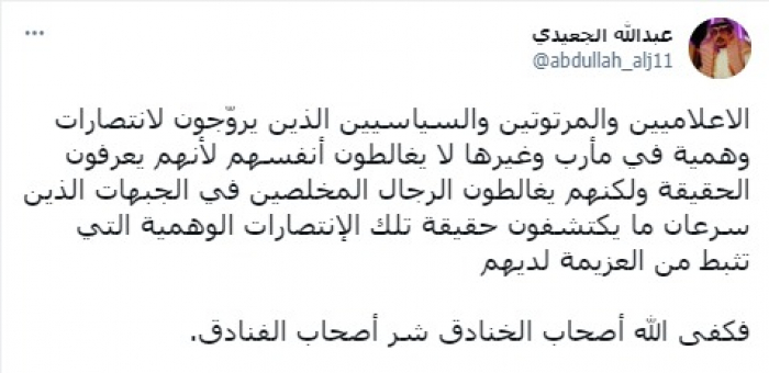 وأشار في تغريدة على حسابه بموقع التدوين المصغر تويتر، اليوم إلى أن: "الاعلاميين والمرتوتين والسياسيين الذين يروّجون لانتصارات وهمية في مأرب وغيرها لا يغالطون أنفسهم لأنهم يعرفون الحقيقة".