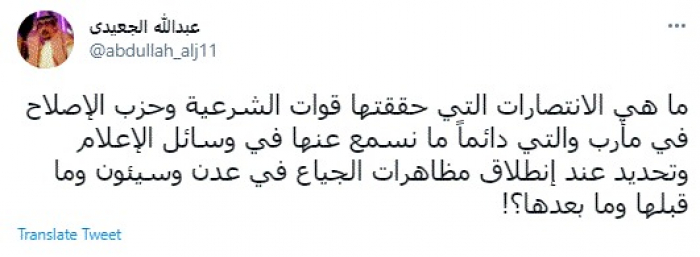 وقال في تغريدة عبر "تويتر" رصدها "المشهد العربي": "ما هي الانتصارات التي حققتها قوات الشرعية وحزب الإصلاح في مأرب والتي دائمًا ما نسمع عنها في وسائل الإعلام وتحديد عند انطلاق مظاهرات الجياع في عدن وسيئون وما قبلها وما بعدها".