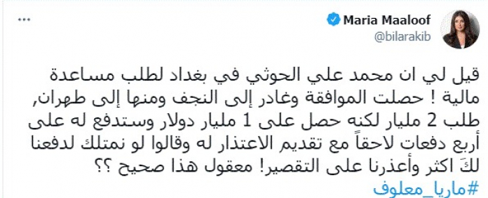 وقالت في تغريدة عبر "تويتر" رصدها "المشهد العربي": "قيل لي أن محمد علي الحوثي في بغداد لطلب مساعدة مالية! حصلت الموافقة وغادر إلى النجف ومنها إلى طهران، طلب 2 مليار لكنه حصل على 1 مليار دولار وستدفع له على أربع دفعات لاحقًا مع تقديم الاعتذار له وقالوا لو نمتلك لدفعنا لكَ اكثر وأعذرنا على التقصير! معقول هذا صحيح ؟؟".