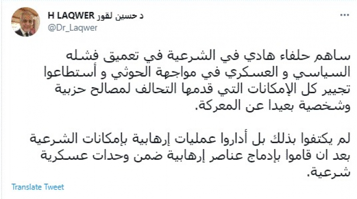 وقال في تغريدة عبر "تويتر" رصدها "المشهد العربي": "ساهم حلفاء هادي في الشرعية في تعميق فشله السياسي والعسكري في مواجهة الحوثي واستطاعوا تجيير - تحويل - كل الإمكانات التي قدمها التحالف لمصالح حزبية وشخصية بعيدًا عن المعركة".
