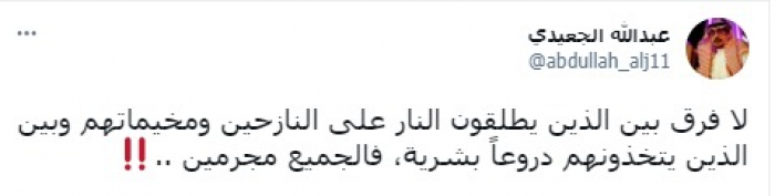 وقال في تغريدة على حسابه بموقع التدوين المصغر تويتر، اليوم إنه: "لا فرق بين الذين يطلقون النار على النازحين ومخيماتهم وبين الذين يتخذونهم دروعا بشرية"، مشددا على أن: "الجميع مجرمون" .