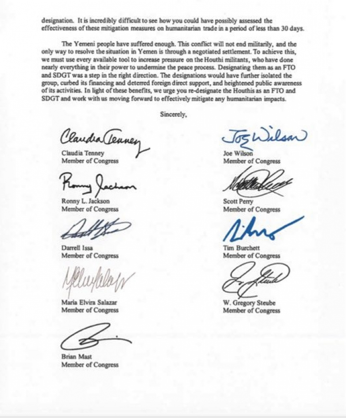 وقالت الرسالة التي جمع توقيعاتها النائبين الجمهوريين، كلوديا تيني والنائب جو ويلسون، إن كل الشروط متوفرة لتصنيف الحوثيين على قائمة الإرهاب.