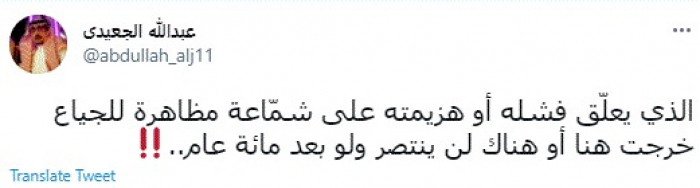 وكتب في تغريدة عبر "تويتر" رصدها "المشهد العربي": "الذي يعلّق فشله أو هزيمته على شمّاعة مظاهرة للجياع خرجت هنا أو هناك لن ينتصر ولو بعد مائة عام".