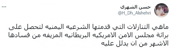 الشهري يتساءل: ما التنازلات التي قدمتها الشرعية للحصول على البراءة من اتهامات الفساد؟