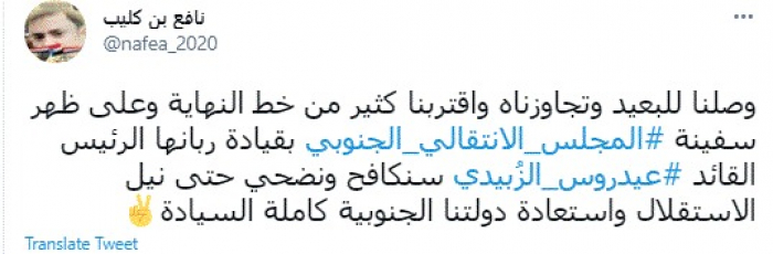 وكتب في تغريدة عبر "تويتر" رصدها "المشهد العربي": "وصلنا للبعيد وتجاوزناه واقتربنا كثير من خط النهاية وعلى ظهر سفينة المجلس الانتقالي الجنوبي بقيادة ربانها الرئيس القائد عيدروس الزُبيدي سنكافح ونضحي حتى نيل الاستقلال واستعادة دولتنا الجنوبية كاملة السيادة".