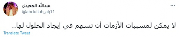 وكتب في تغريدة عبر "تويتر" رصدها "المشهد العربي": "لا يمكن لمسببات الأزمات أن تسهم في إيجاد الحلول لها".